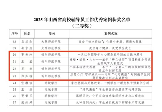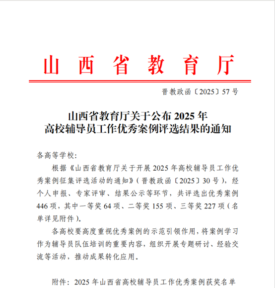 近日,省教育厅公布了2025年山西省高校辅导员工作优秀案例评选结果。我校辅导员曹美玲、王宏、郑茹楠在优秀案例评选中载誉而归,凭借在长期工作中积淀的扎实育人功底与创新工作方法,所选送案例全部获得二等奖的优异成绩。
