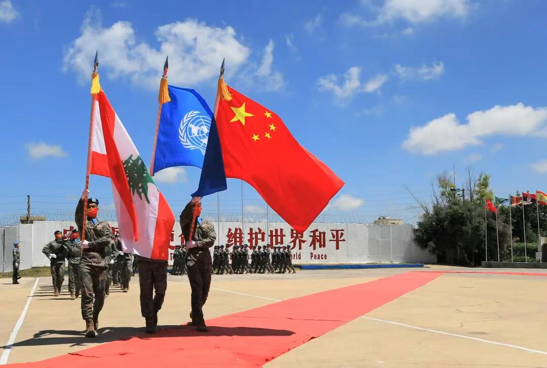 在黎巴嫩南部辛尼亚村的中国维和部队营区,中国维和部队官兵在受勋后通过观礼台(2022年7月1日摄)。 新华社记者 刘宗亚 摄