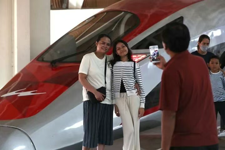 6月19日,在印度尼西亚雅加达哈利姆站站台,两名乘客与雅万高铁高速动车组列车合影。 新华社记者 岑云鹏 摄