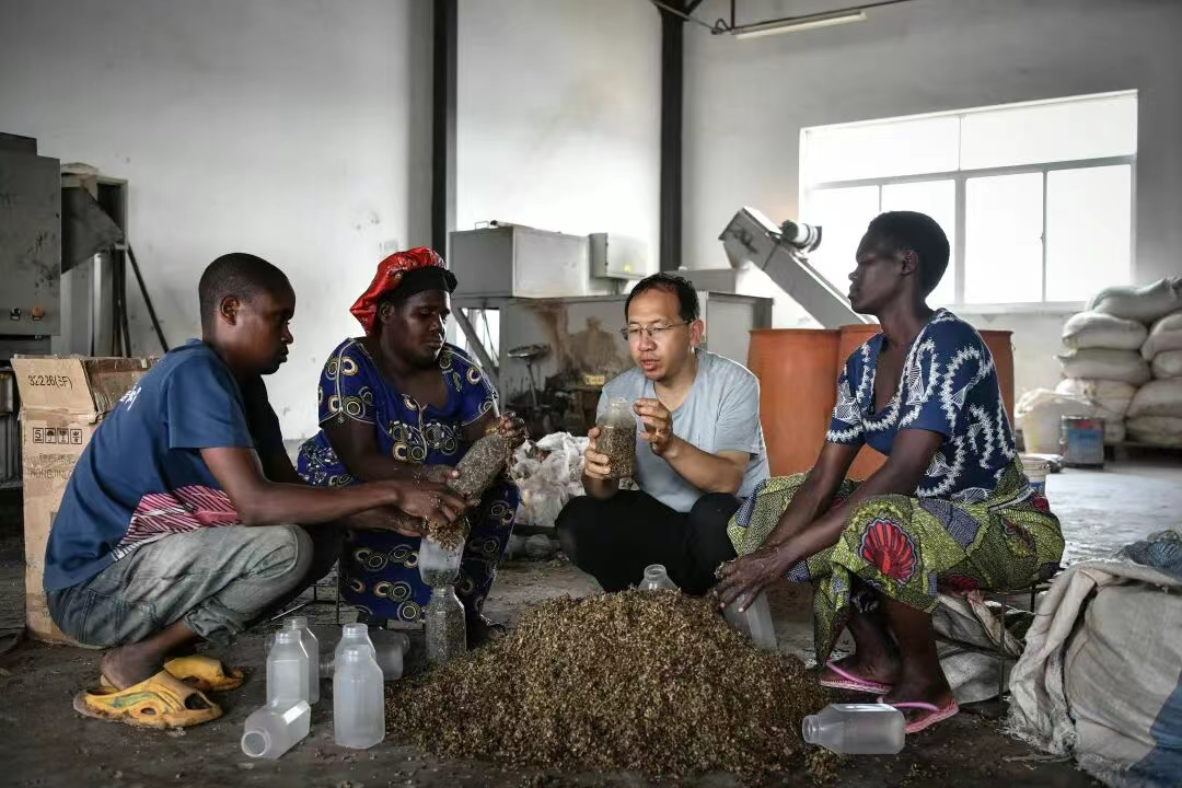 2024年8月13日,在卢旺达南方省胡耶区的中国援卢农业技术示范中心,菌草专家陈晓斌(右二)与当地农民一起制作菌种培养料。新华社记者 韩旭 摄